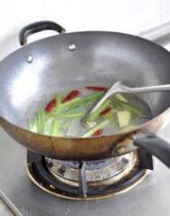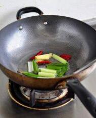起锅倒入一点点油,盖锅底即可。放入葱姜干辣椒爆香。