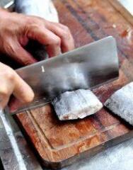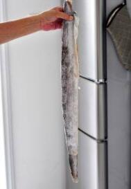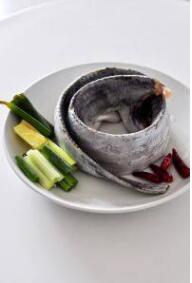 带鱼去头,洗净肚里的黑膜。收拾干净。