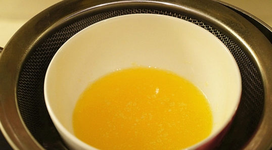 用水浴法加热无盐黄油,使之水分蒸发掉,除去杂质,剩下纯净透亮的净化黄油。