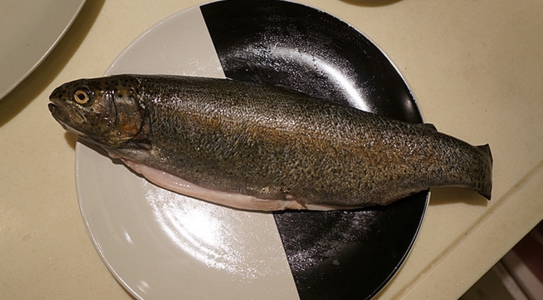除去鳟鱼的鱼鳍和内脏, 用厨房纸巾吸尽多余的汁液。