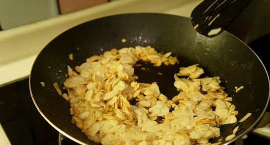 在小锅中融化含盐黄油,直到黄油颜色变深。加入杏仁片,慢火翻炒至变黄,挤入柠檬汁溶解锅底的固体物,并煮沸即可。