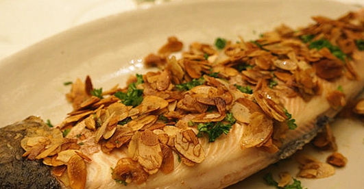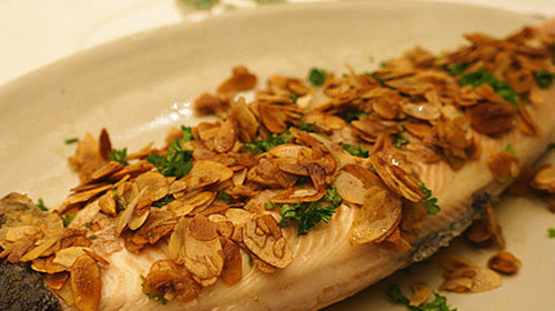 轻轻剥去鱼皮,装盘。欧芹切碎,跟黄油炒杏仁一起撒上即可。