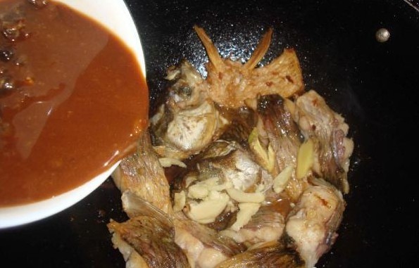 锅烧热,加色拉油。,鱼块煎好后,加姜蒜,再加豆豉水焖煮