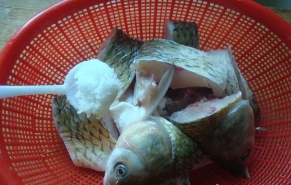 将青鱼改成小块,往鱼块上撒盐,腌制,同时沥去血水