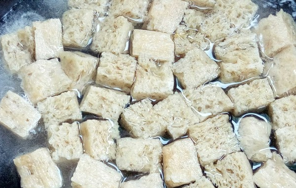 烤麸泡开,切块,烧开水加2克盐和料酒煮5分钟捞出冷水冲凉。
