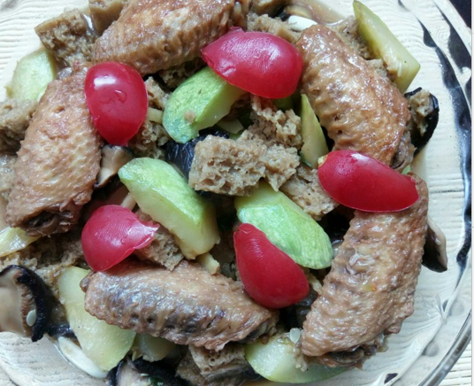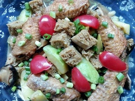 放入酱油、胡椒粉和烤麸炖至收汤,加入剩下的盐、葱和蒜翻炒匀既可出锅。我把昨天做的鸡翅中,剩下的几个也放上了。