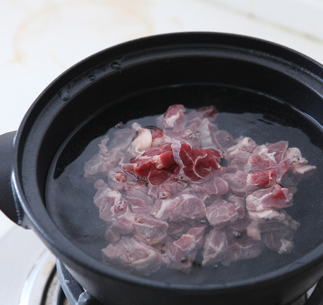 锅中适量水,倒入料酒和牛肉丁,焯水,撇除浮沫和血水,捞出