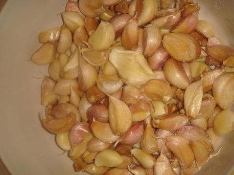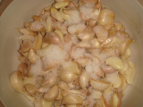 把大蒜的瓣洗干净,剥的时候可以留下一层衣,然后加入盐