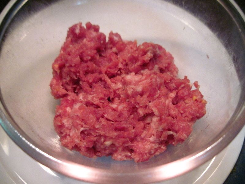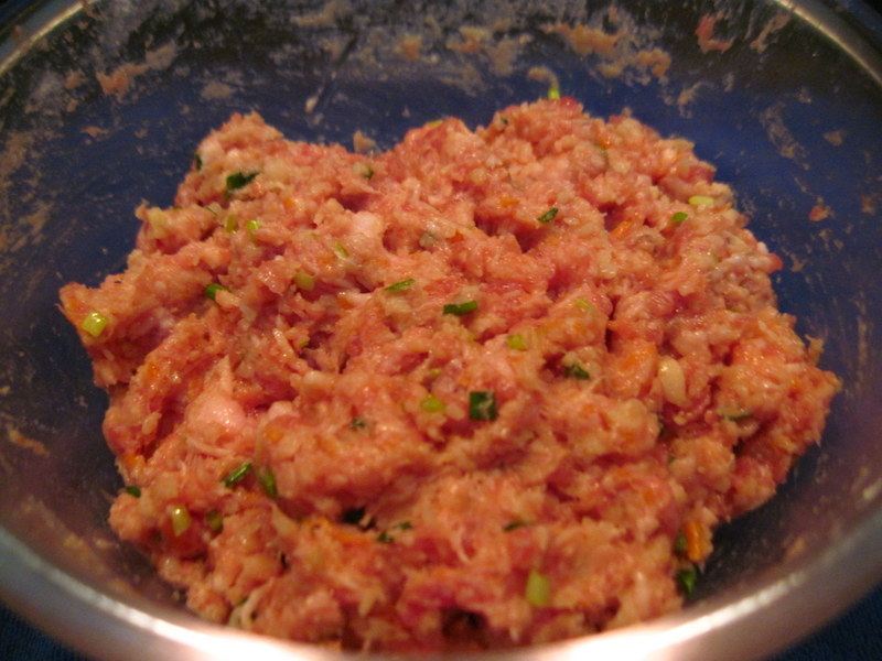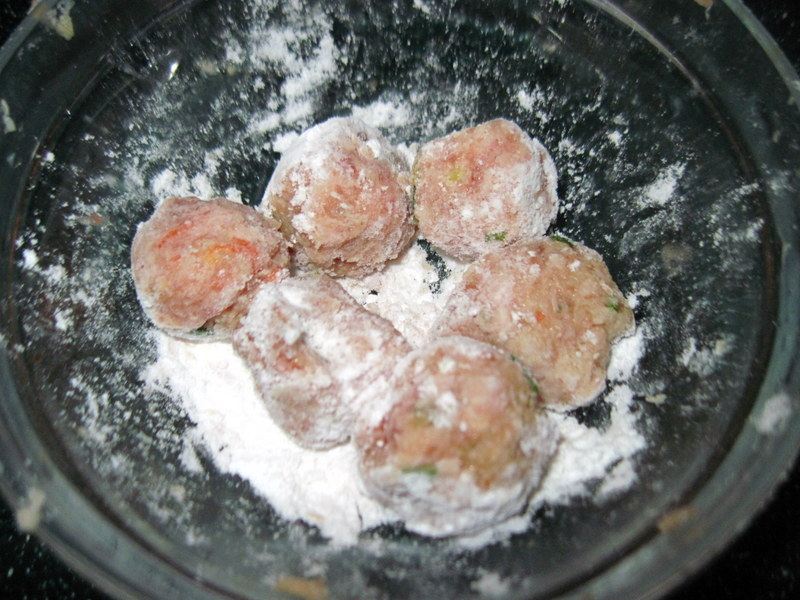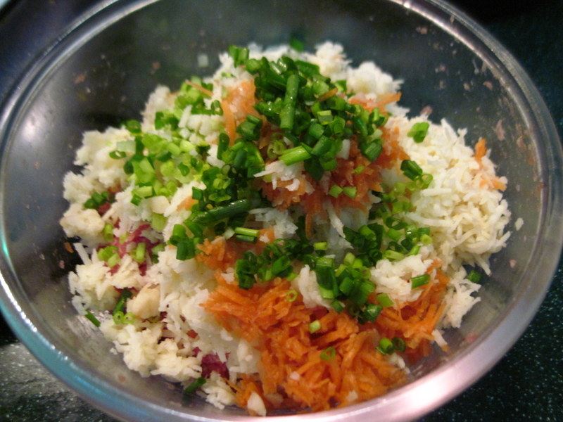 把切好的葱花、慈菇、在红萝卜放到肉里