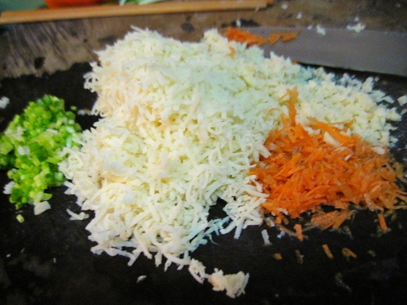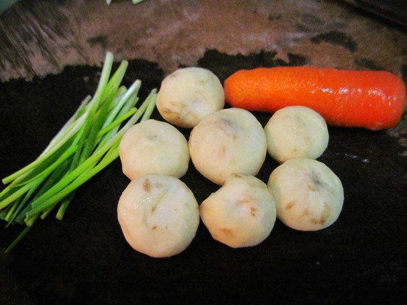 葱切花慈菇切细丝红萝卜也切细丝,有瓜刨最好用瓜刨来刨慈菇和红萝卜