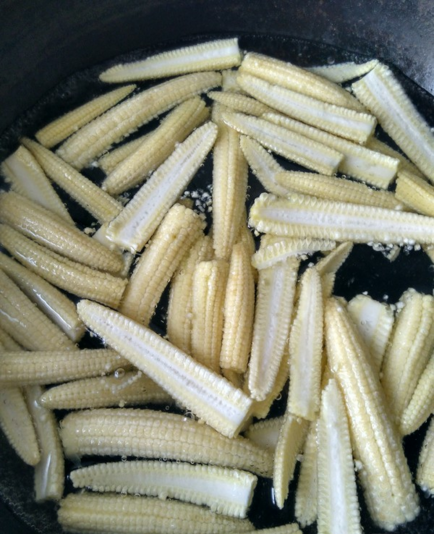 锅中注水汆烫玉米笋,