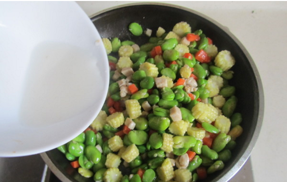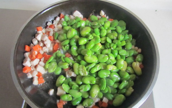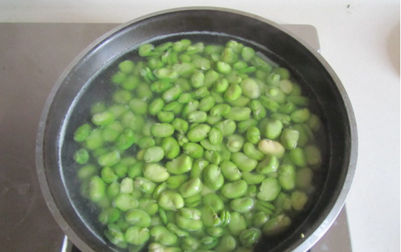 再放入蚕豆米焯煮到八、九成熟后盛出备用;