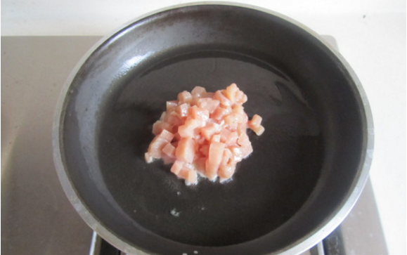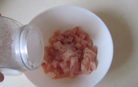 鸡脯肉切成小丁, 加入盐、淀粉和适量料酒, 拌均匀腌制一下;