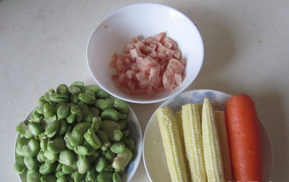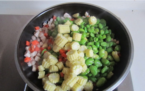 1. 焯菜时加入几滴油和适量的盐, 将需要提前焯煮的食材现焯煮八、九成熟;2. 注意蚕豆一定要炒熟才能吃; 2. 红萝卜要先加入油中煸炒有利于胡萝卜素的吸收; 3. 最后加入点水淀粉勾薄芡。