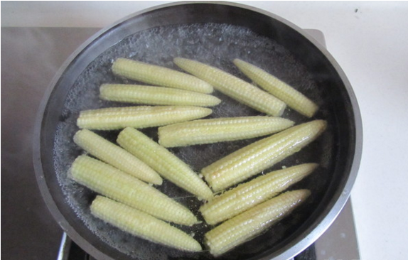 烧锅开水, 加入适量的盐和几滴油, 放入玉米笋炒煮一、两分钟后捞出切成小块;