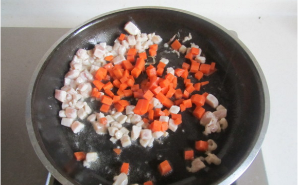 鸡肉丁煸炒变色后下入红萝卜丁进去煸炒;