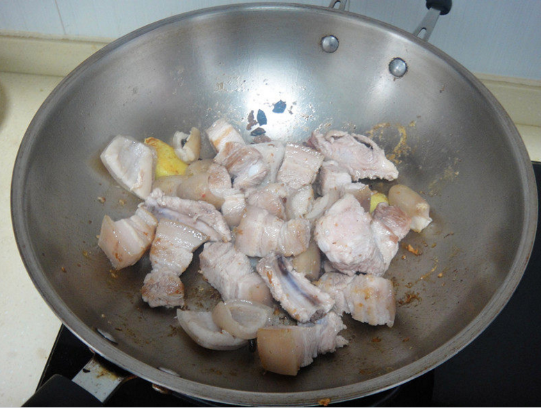 倒入五花肉块加入料酒(料酒多一点)