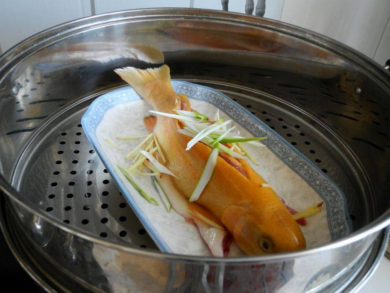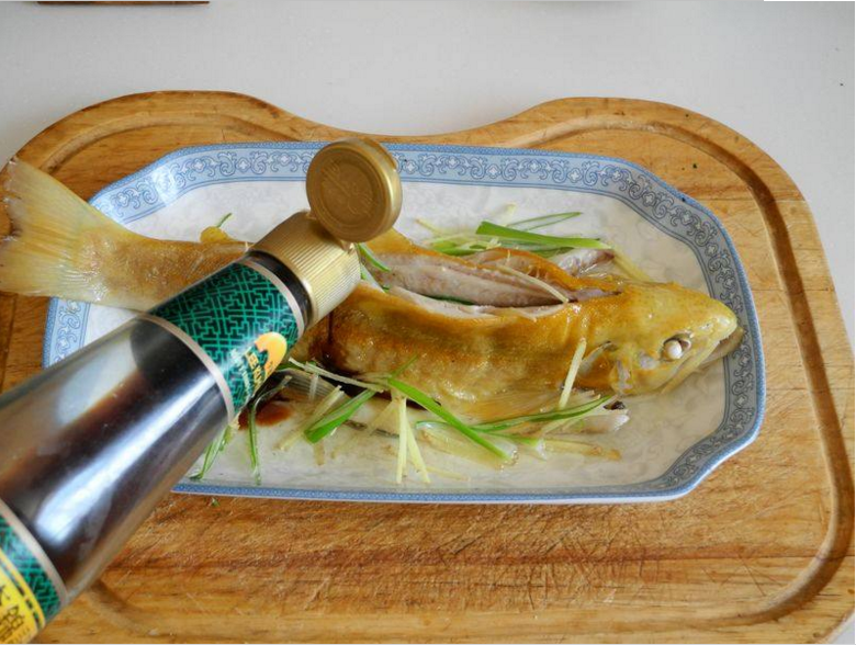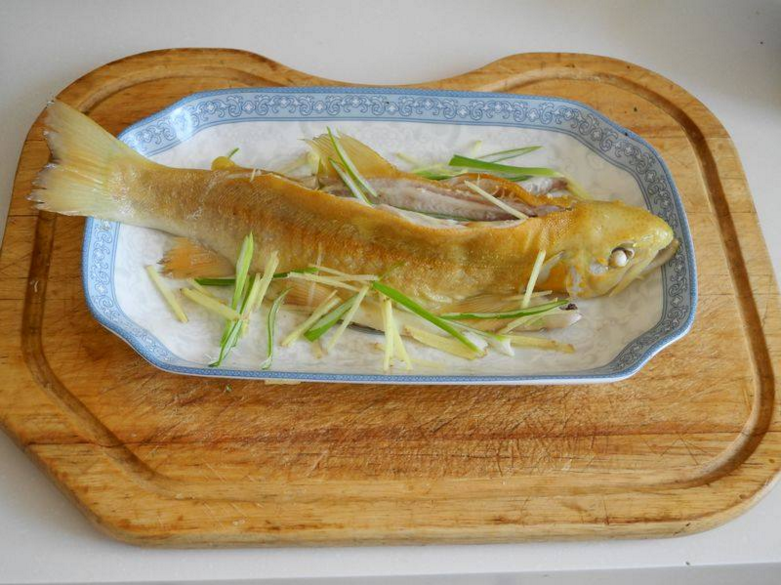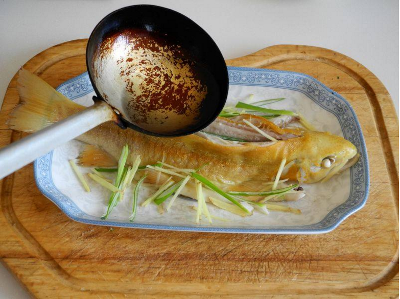 将蒸好的汤汁倒掉,检出葱姜丝,再重新撒上一些葱姜丝。