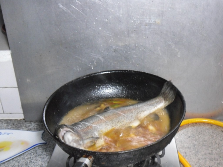 因为“虹鳟鱼”的肉质细嫩,新鲜的比较适合清蒸。这条虹鳟鱼是冰箱里冷冻储存的,解冻之后选择了用“郫县豆瓣酱”烧制,一是可以解腻提味,二是换一种口味。烧制之后的虹鳟鱼,味道还是不错的。