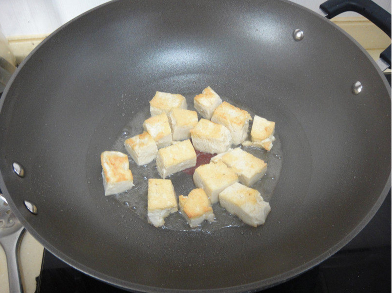 锅内倒油,温油下冻豆腐煎至两面微黄捞起