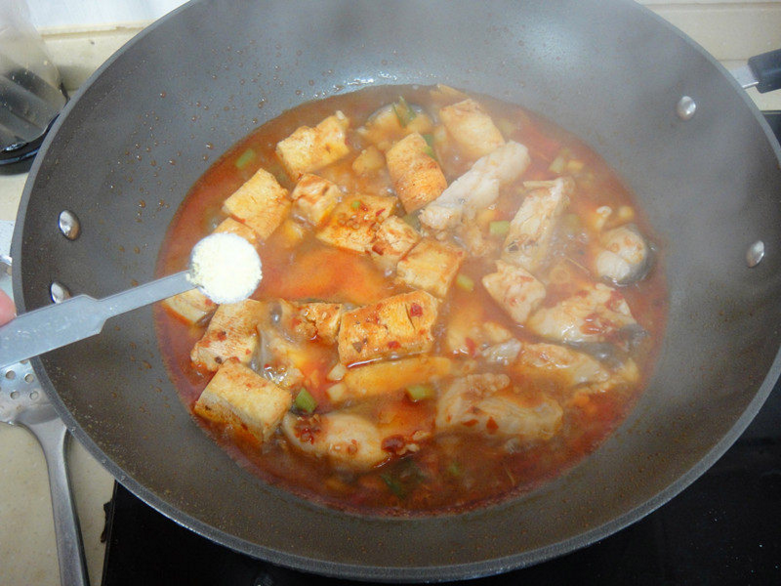 盖上大火煮开后转中小火,让鱼块和冻豆腐融合煮熟