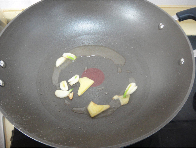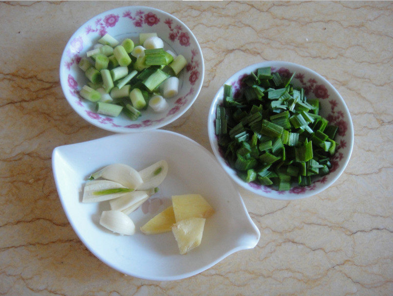 大蒜头和生姜切片,青蒜洗净后把梗和叶子分别切段