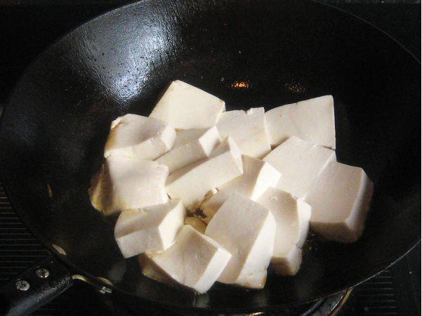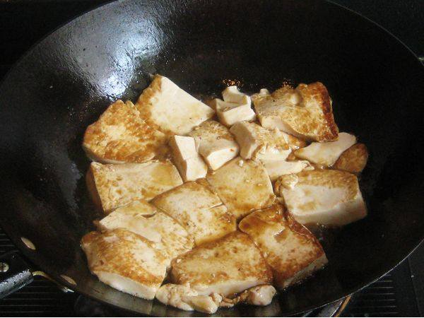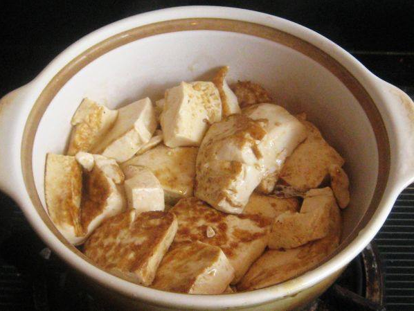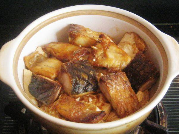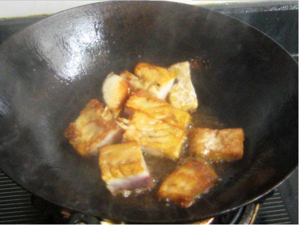 咸青鱼用水浸泡半天洗净切块,用油煎成两面金黄,盛出