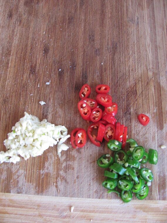 蒜切末,青红椒切圈。