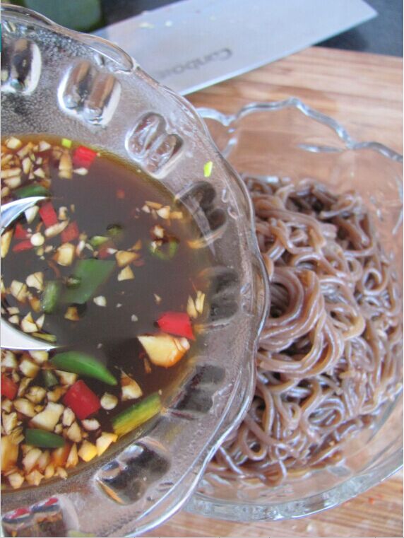 把调味汁浇入蕨根粉中拌均匀。
