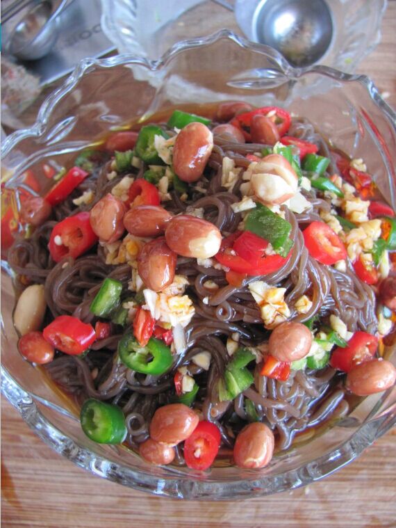 然后撒上青红椒圈和蒜末,油炸花生米摆盘即好。