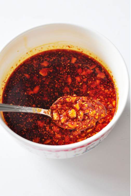 辣椒粉用热油浇成辣椒油,花生拍碎放入。