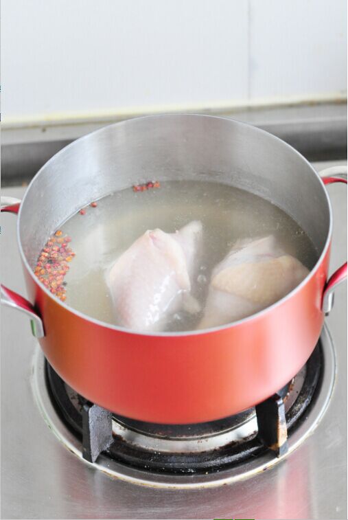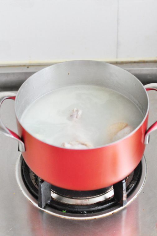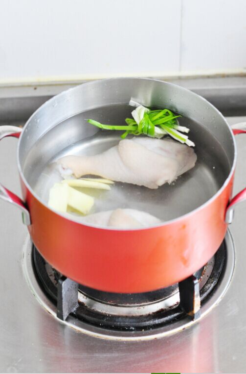 加姜,葱结大火煮沸转小火炖鸡汤。