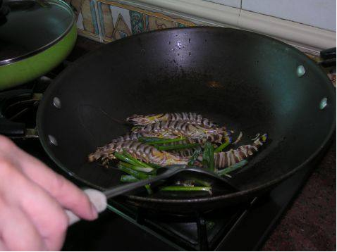 03 放入九节虾,快速翻炒后,加入花雕酒