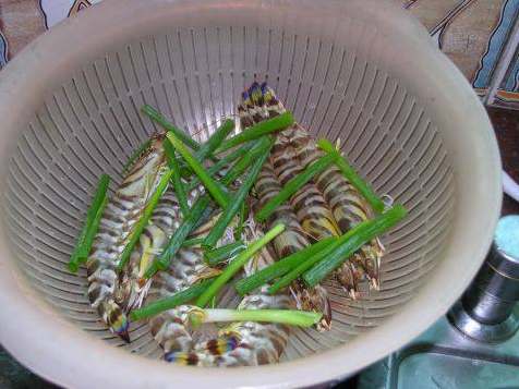 01 九节虾洗净,和葱段备好。