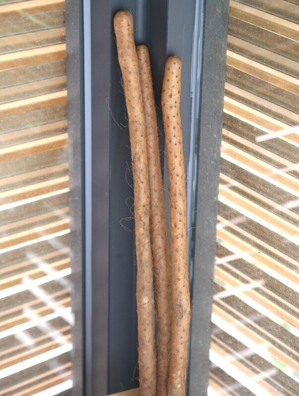 这就是铁棍山药,细而长的;整根的山药买来后放在阴凉处,可以存放很长时间。