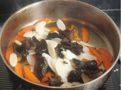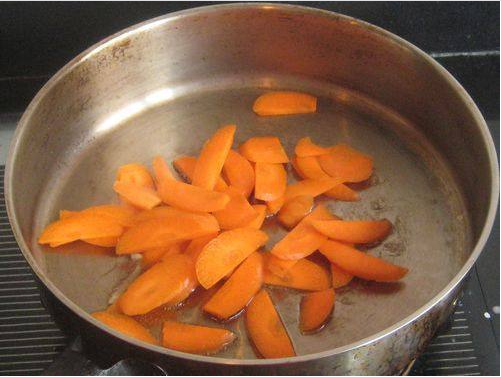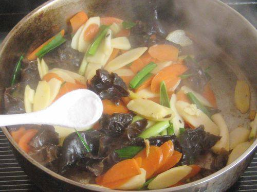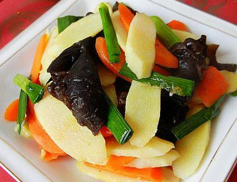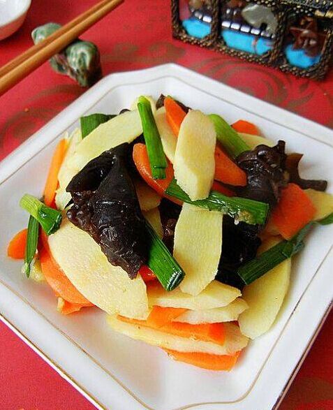 待胡萝卜有些发蔫,放下山药与黑木耳煸炒1分钟.