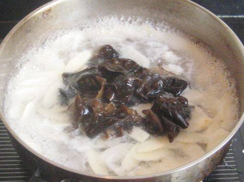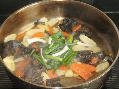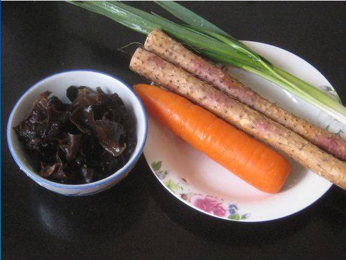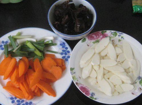 山药去皮洗净切片,胡萝卜洗净切片,青蒜洗净切段,黑木耳洗净撕小块.
