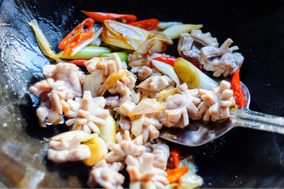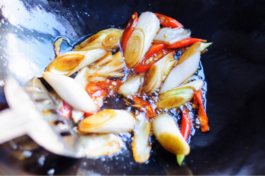 炒锅里倒油烧热后放葱段和辣椒,大火翻炒。