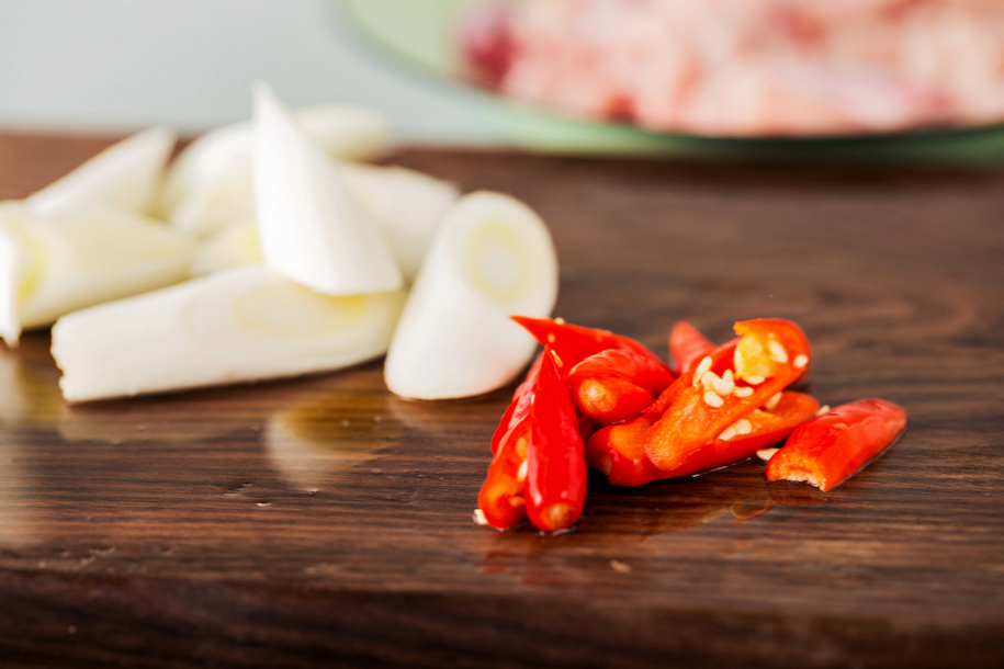 大葱切斜段,红尖椒切片。