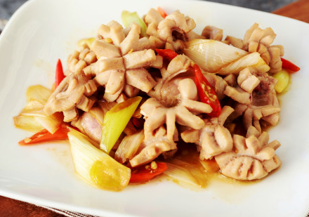 葱段变色后倒进羊蛋花,调进酱油和精盐大火炒熟。