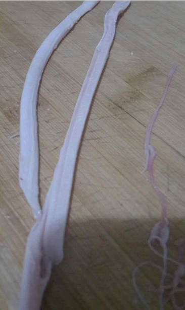 纵向切开,将中间的输尿管剥离,切成寸段。