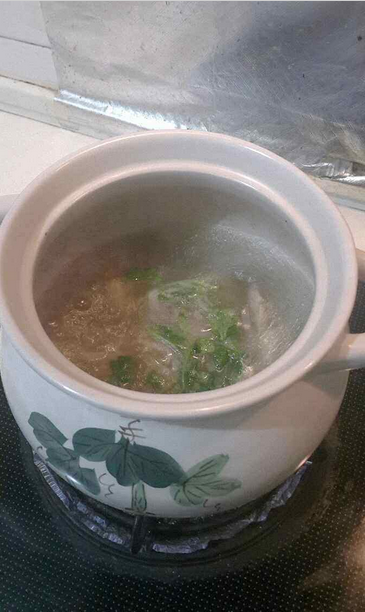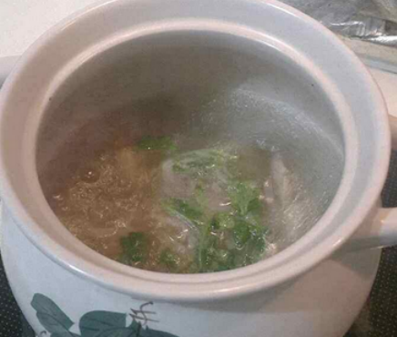 加入热水姜丝煲制,出锅前加料酒盐白胡椒粉香油香菜出锅。