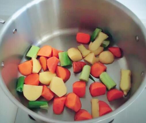 将牛尾焯水后洗净备用,土豆、胡萝卜切块备用。