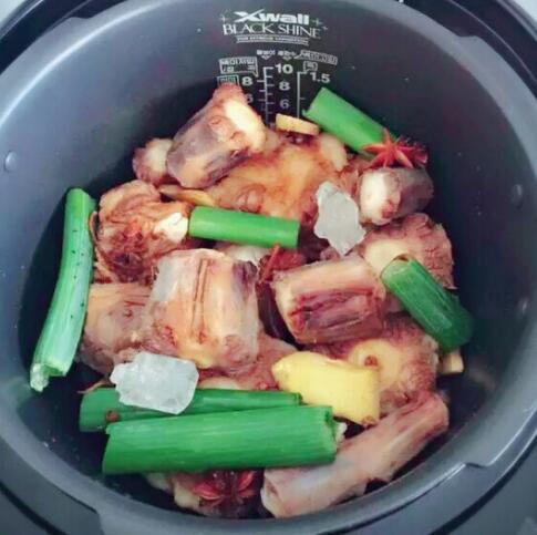 将牛尾先放入高压锅闷烧半小时,放入少许酱油,糖,料酒,葱姜。闷熟后捞出。